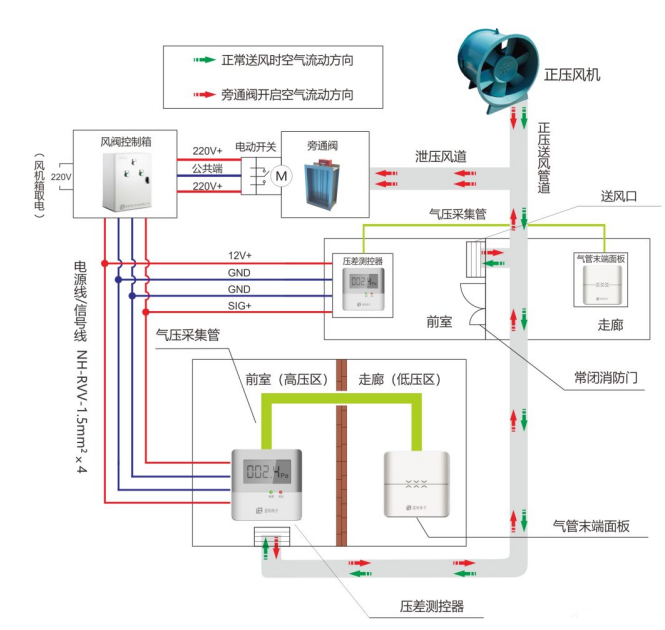加壓—正壓送風(fēng)系統(tǒng)啟動后,正壓風(fēng)機將會按照上圖中綠色箭頭方向,將空氣送入相應(yīng)樓梯間、前室/合用前室,導(dǎo)致相應(yīng)空間壓力增大。