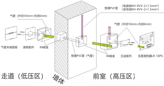 在前室、樓梯間壓力(壓差)傳感器安裝之前,建議按照下圖做預(yù)埋處理,安裝將更加方便,且更加美觀。